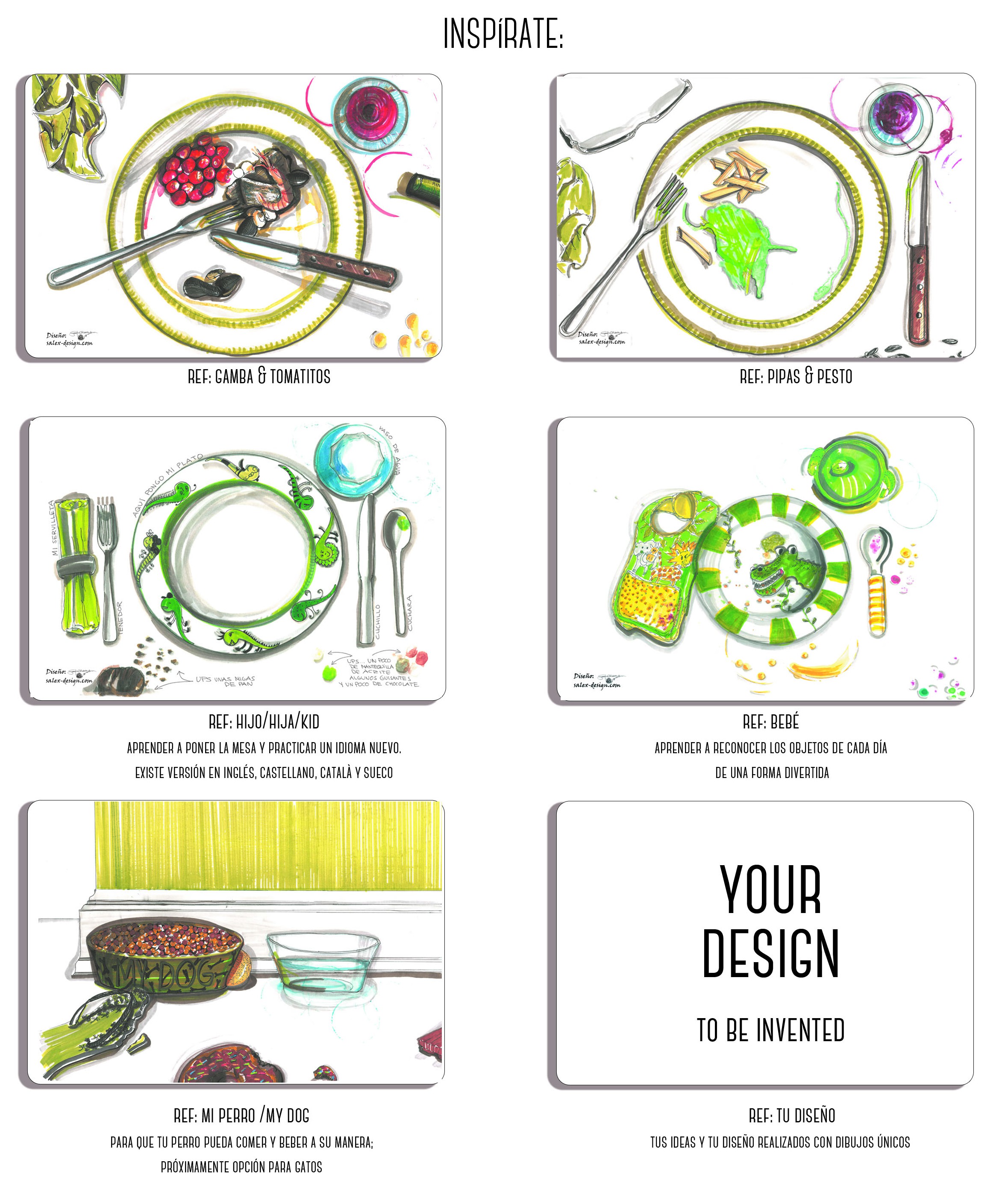 Our idea is to create personal and individual table mats based on unique hand drawn illustrations. For people who enjoy to eat and have fun at the same time. We have 10 different types. We print on recyclable material. We offer also a line for a more educational purpose…& remember Salex-Design will happily design custom-made design upon request! Get inspired!